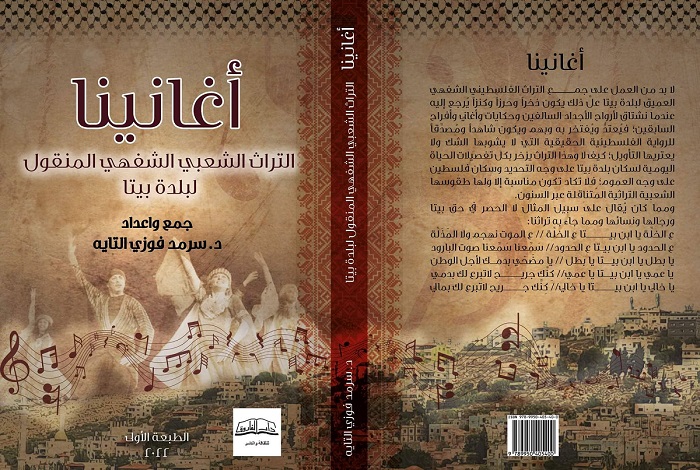 رام الله 21-4-2022 وفا- صدر حديثا عن دار الفاروق للثقافة والنشر في نابلس، كتاب جديد للكاتب والباحث الدكتور سرمد فوزي التايه، تحت عنوان "أغانينا – التراث الشعبي الشفهي المنقول لبلدة بيتا".