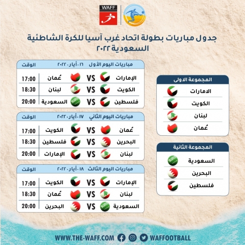 القدس 27-4-2022 وفا- وضعت قرعة بطولة غرب آسيا للكرة الشاطئية- السعودية 2022، منتخبَنا الوطني في المجموعة الثانية إلى جانب منتخبيْ البحرين والسعودية.