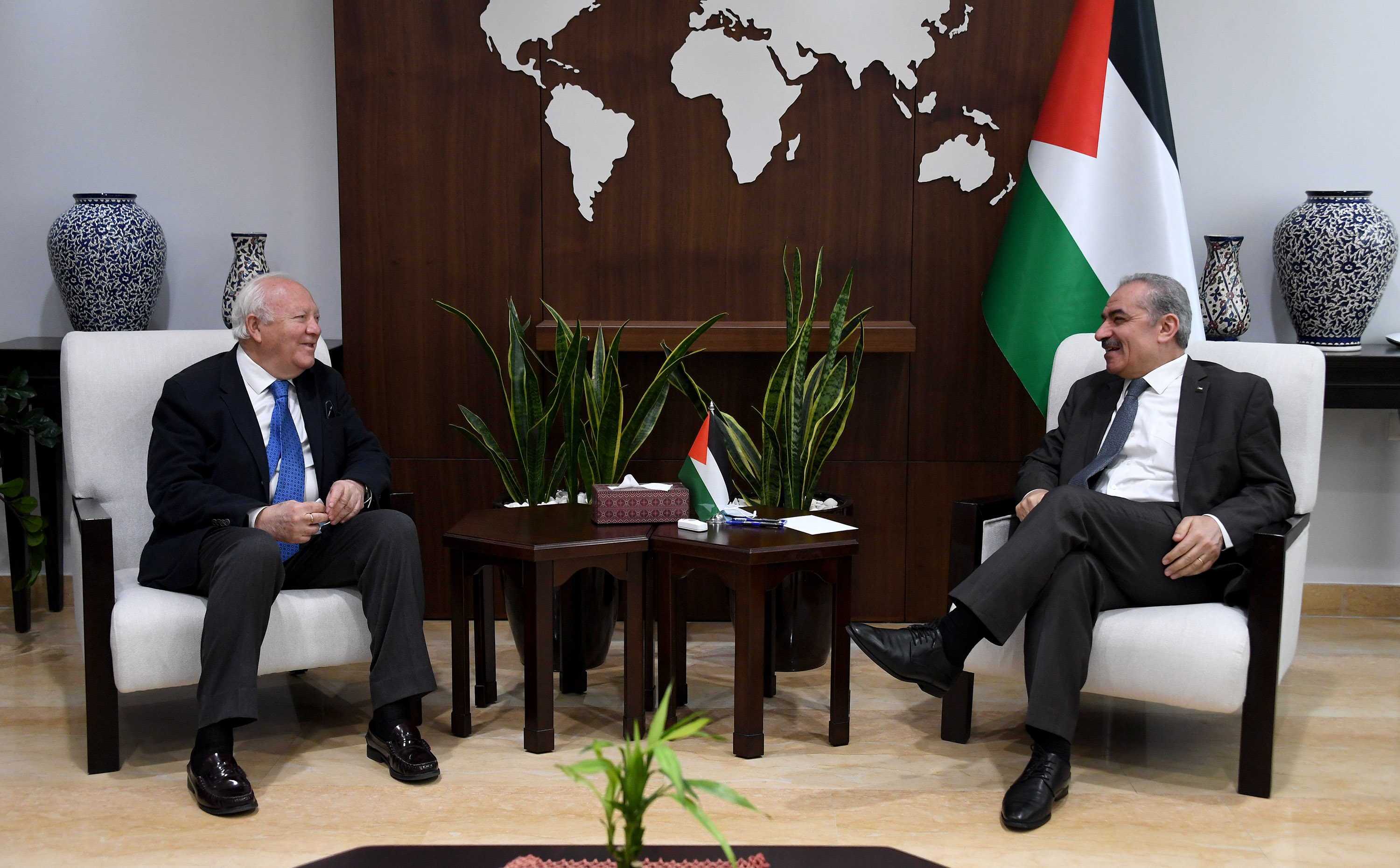 رام الله 28-4-2022 وفا- بحث رئيس الوزراء محمد اشتية، في مكتبه بمدينة رام الله، اليوم الخميس، مع الممثل السامي للأمم المتحدة لتحالف الحضارات ميغيل أنخيل موراتينوس، آخر التطورات على المستوى السياسي، ومستجدات الأوضاع في فلسطين.