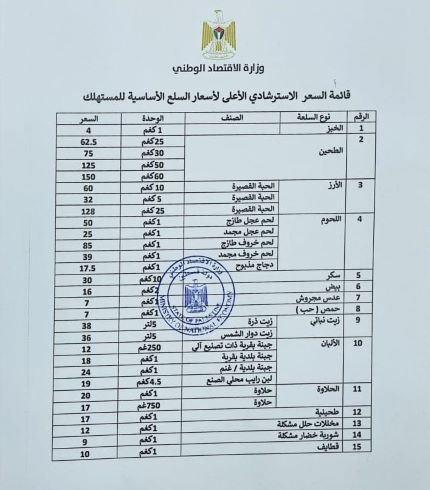 رام الله 3-4-2022 وفا- نشرت وزارة الاقتصاد الوطني، اليوم الاحد، قائمة السقف السعري الاسترشادي الاعلى للمستهلك، التي تضم 15 سلعة أساسية تتفرع إلى أصناف، تمثل الأكثر استهلاكا في سلة المستهلك خلال شهر رمضان المبارك.