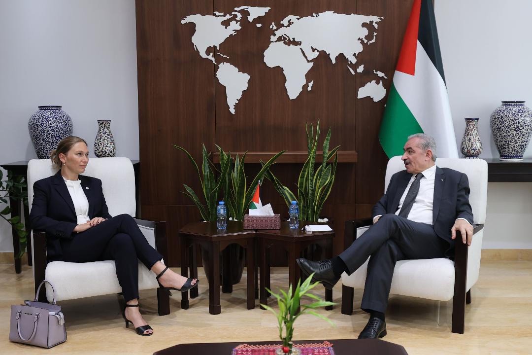 رام الله 15-5-2022 وفا- التقى رئيس الوزراء محمد اشتية، اليوم الأحد، في مكتبه برام الله، رئيسة بعثة الصليب الأحمر في القدس إليس دوبوف التي تشارف مهمتها على الانتهاء برفقة المدير الجديد أولا أولمو.