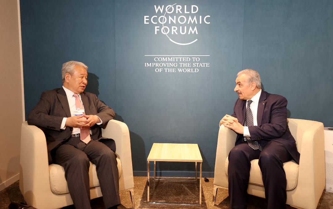 دافوس 23-5-2022 وفا- التقى رئيس الوزراء محمد اشتية، اليوم الإثنين، على هامش مشاركته في منتدى الاقتصاد العالمي (دافوس) في سويسرا، رئيس الوكالة اليابانية للتعاون الدولي (جايكا) أكيهيكو تاناكا.