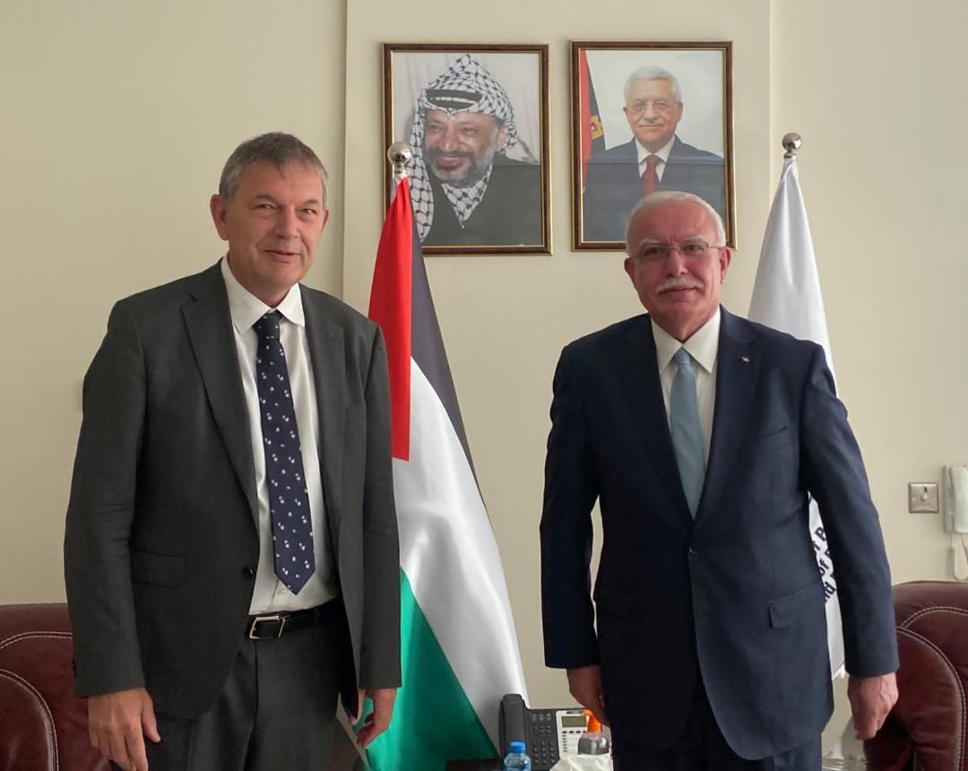 رام الله 24-5-2022 وفا- التقى وزير الخارجية والمغتربين رياض المالكي، اليوم الثلاثاء، في مقر الوزارة بمدينة رام الله، المفوض العام لوكالة الأمم المتحدة لغوث وتشغيل اللاجئين الفلسطينيين في الشرق الأدنى (الأونروا)، فيليب لازاريني، بحضور القائمة بأعمال مديرة عمليات الوكالة بالضفة الغربية سينديكتا نكومراه.