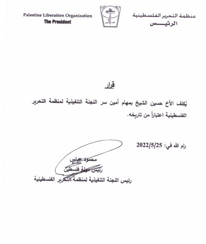 رام الله 26-5-2022 وفا- أصدر رئيس دولة فلسطين محمود عباس، قرارا بتكليف الأخ حسين الشيخ، بمهام أمين سر اللجنة التنفيذية لمنظمة التحرير الفلسطينية، اعتبارا من تاريخه.