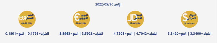 رام الله 30--52022 وفا- جاءت أسعار العملات مقابل الشيقل الإسرائيلي، اليوم الإثنين، حسب سلطة النقد، على النحو التالي: