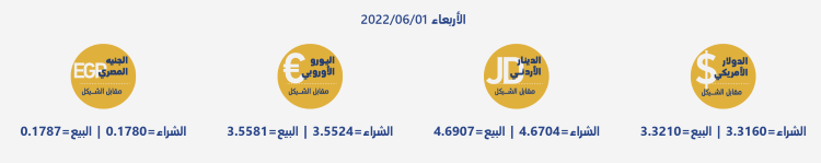 رام الله 1-6-2022 وفا- جاءت أسعار العملات مقابل الشيقل الإسرائيلي، اليوم الأربعاء، حسب سلطة النقد، على النحو التالي: