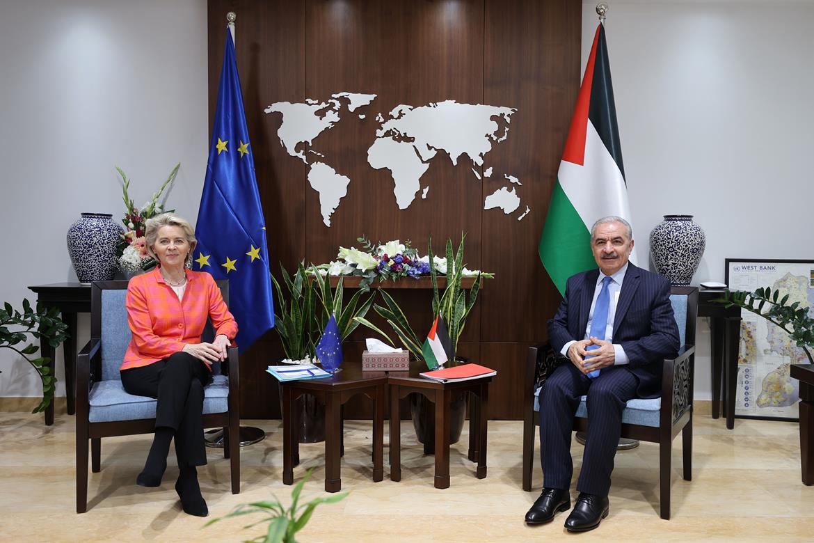 وقال رئيس الوزراء، في تصريح صحفي سبق الاجتماع: "يسعدني اليوم استقبال رئيسة المفوضية الأوروبية وهي تقوم بزيارة لفلسطين، أوروبا جارة فلسطين في البحر الأبيض المتوسط، ونحن شركاء في أمن المتوسط والغاز فيه".