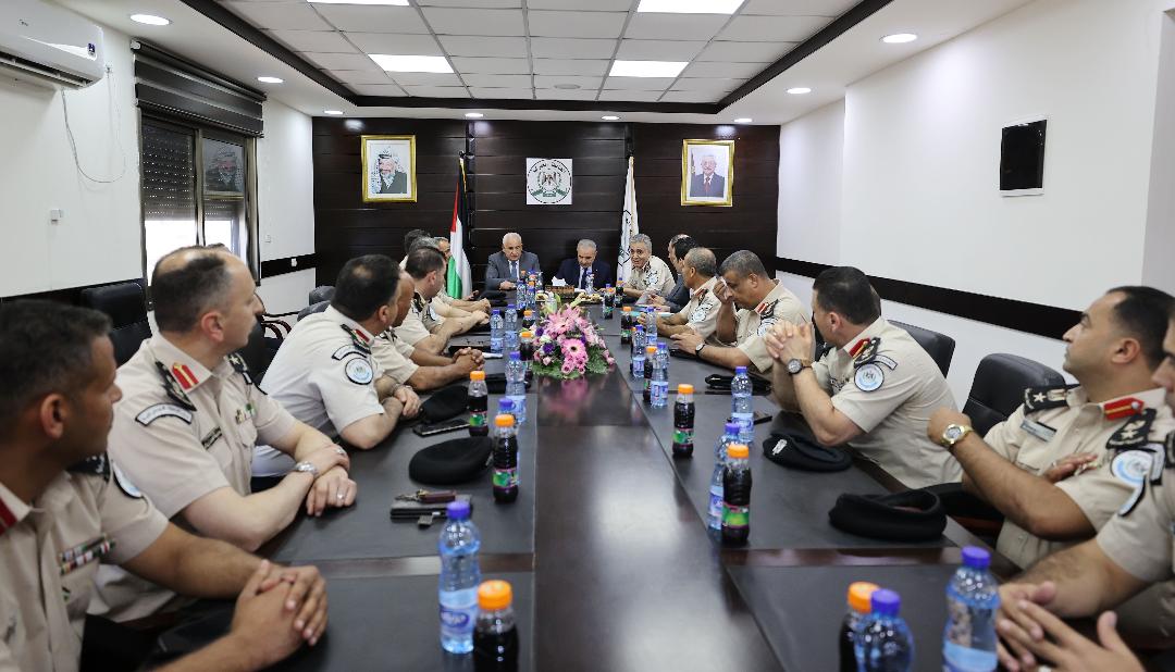 رام الله 19-6-2022 وفا- تفقد رئيس الوزراء محمد اشتية، يرافقه وزير الداخلية اللواء زياد هب الريح، اليوم الأحد، قيادة جهاز الضابطة الجمركية في رام الله، حيث التقى مدير عام الجهاز اللواء إياد بركات ومدراء الإدارات.