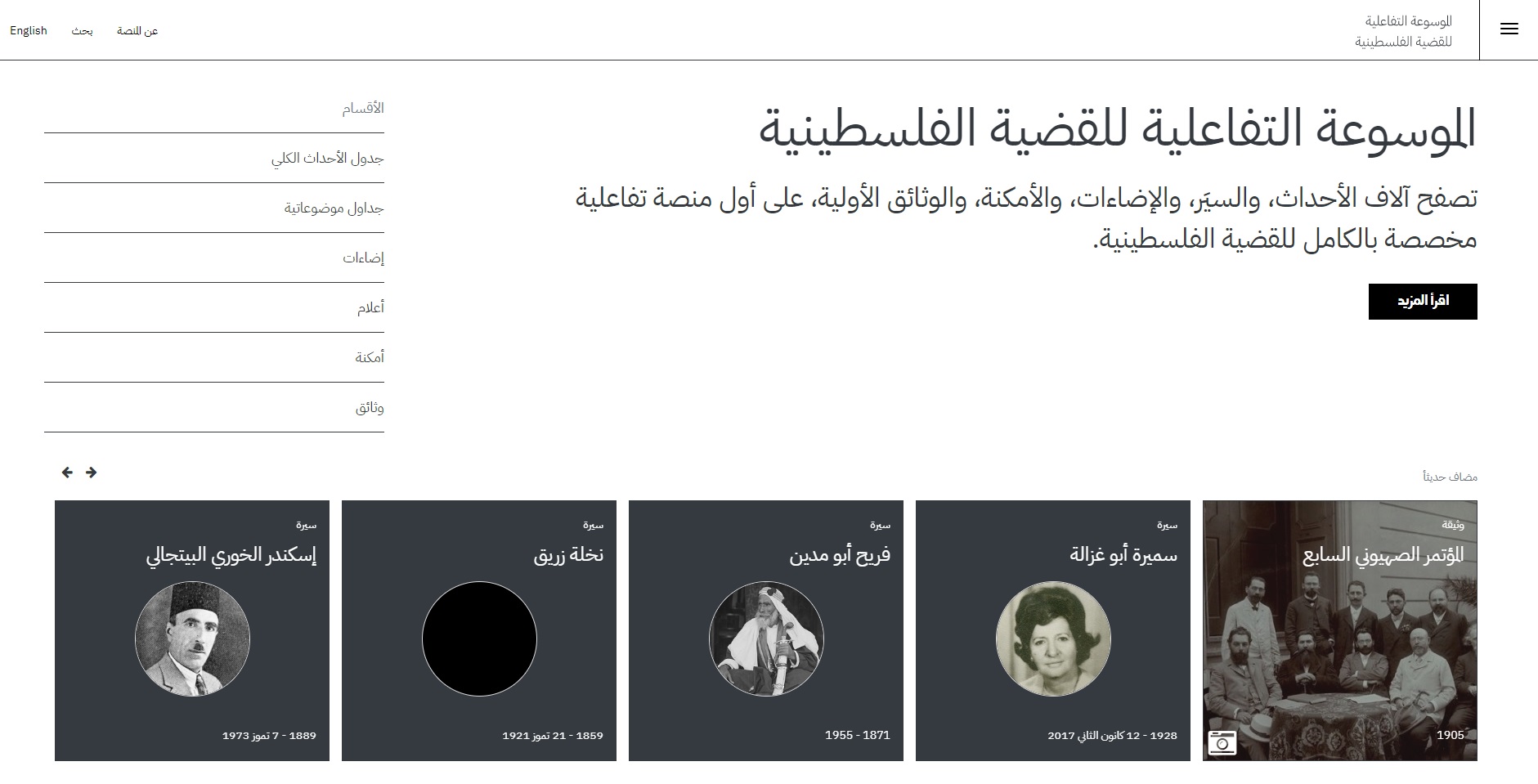 وتتيح الموسوعة المختصّة بتاريخ فلسطين المعاصر منذ نهاية الحقبة العثمانيّة حتى اليوم، الفرصة أمام الأكاديميّين والطلّاب والإعلاميّين والجمهور إمكانيّة تصفّح أحداث وتطوّرات رئيسيّة شكّلت التاريخ الفلسطيني المعاصر في المجالات الحربيّة والدبلوماسيّة والسياسيّة والاقتصاديّة والثقافيّة.
