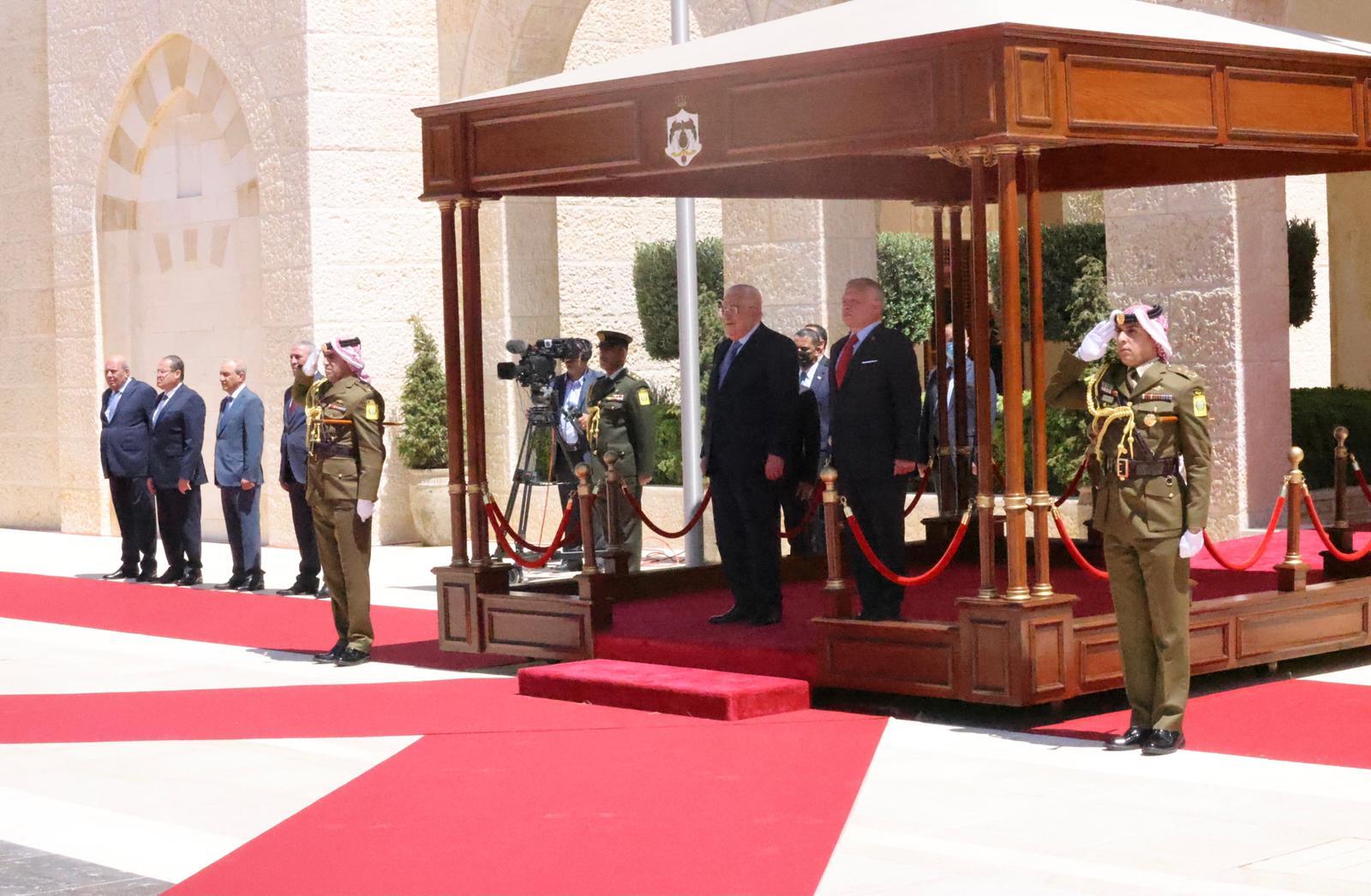 واستعرض الرئيس حرس الشرف الذي اصطف لتحيته، قبل أن يعزف النشيدان الوطني الفلسطيني والملكي الأردني.