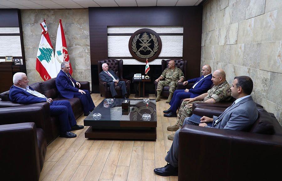 بيروت 30-6-2022 وفا- التقى عضو اللجنتين التنفيذية لمنظمة التحرير الفلسطينية والمركزية لحركة "فتح" عزام الأحمد، اليوم الخميس، قائد الجيش اللبناني العماد جوزاف عون، بحضور سفير دولة فلسطين لدى الجمهورية اللبنانية أشرف دبور وأمين سر حركة "فتح" وفصائل منظمة التحرير الفلسطينية فتحي أبو العرادات.