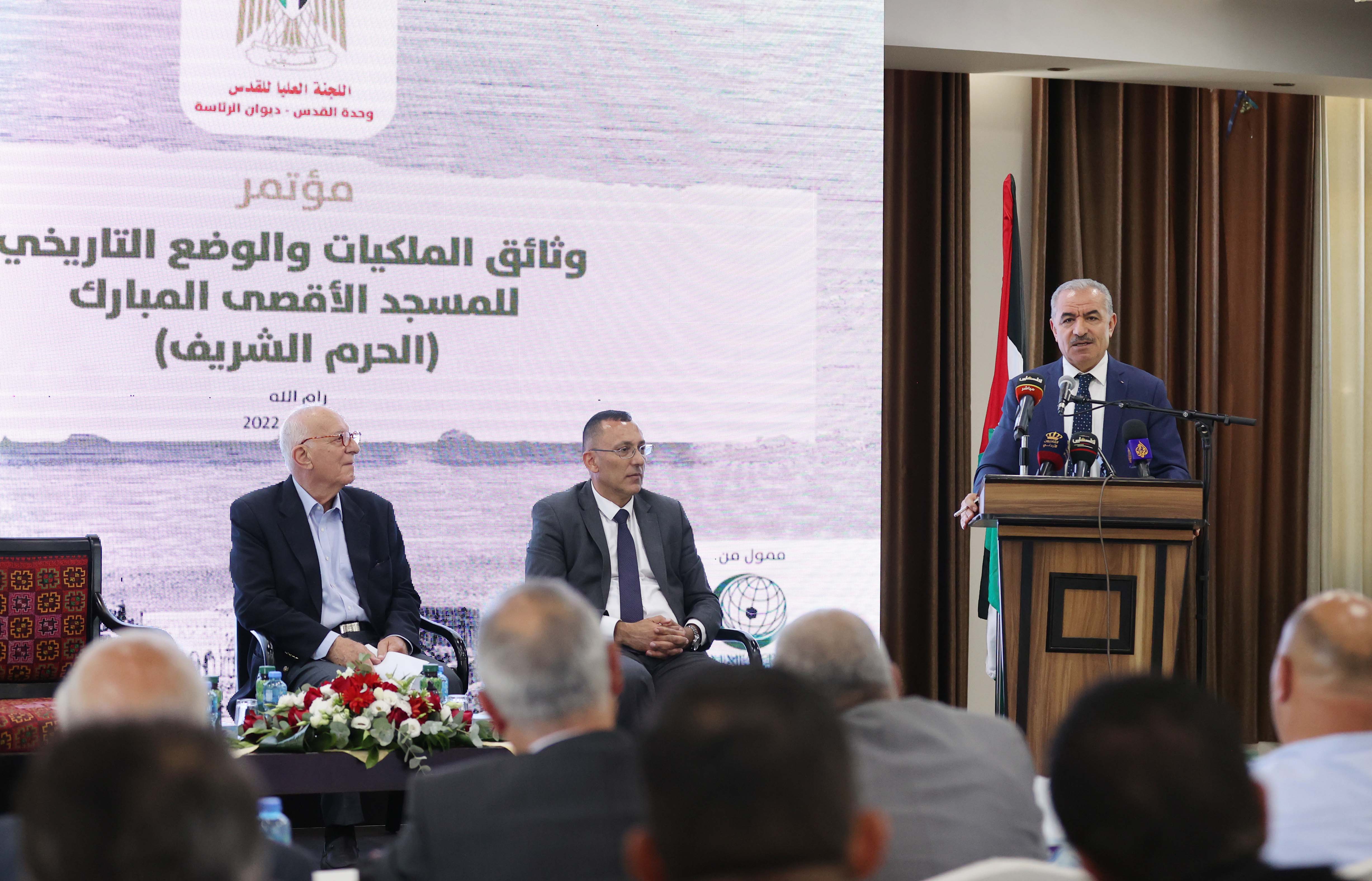 وأضاف رئيس الوزراء: "كل أحياء القدس مستهدفة، فالاحتلال ينتهي من مربع وينتقل إلى مربع آخر، ونحن نواجه ذلك من خلال ترميم البلدة القديمة واحواشها ومساعدة أهلها على الصمود وتعزيز المؤسسات وصمود التجار، والمطلوب تعزيز صمودنا على الأرض، ومطلوب دور عربي وإسلامي ومسيحي من أجل أن نحافظ على القدس كما نريد بمركبها الديني الإسلامي والمسيحي وبكامل تفاصيلها".
