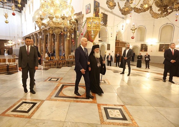 جاء ذلك خلال استقباله الرئيس الأميركي جو بايدن في كنيسة المهد بمدينة بيت لحم، إلى جانب حارس الأراضي المقدسة الأب فرانشيسكو باتون وبطريرك الأرمن الأرثوذكس نورهان مانوغيان، حيث اصطحبوا الرئيس الأميركي في جولة داخل الكنيسة، وتبادلوا معه النقاش بحضور وزيرة السياحة والآثار رلى معايعة وعدد من المسؤولين الفلسطينيين.