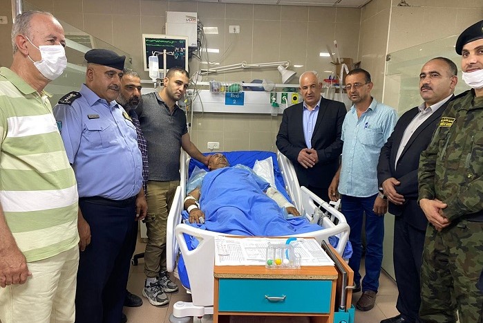 نابلس 23-7-2022 وفا- زار وزير الداخلية زياد هب الريح، وقادة الأجهزة الأمنية في محافظة نابلس، اليوم السبت، مستشفى جامعة النجاح بمدينة نابلس، للاطمئنان على صحة المصابين محمود خطاطبة، والدكتور ناصر الدين الشاعر، وزيد الكايد، ومحمود حجاب، وعمار حجاب، ورافع بسام، إثر تعرضهم لهجوم بالرصاص من قبل خارجين عن القانون.