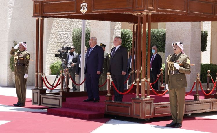 واستعرض سيادته حرس الشرف الذي اصطف لتحيته، حيث عزف النشيد الوطني الفلسطيني والسلام الملكي الأردني.