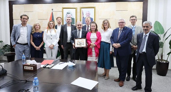 رام الله 25-7-2022 وفا- استقبل رئيس الوزراء محمد اشتية، اليوم الإثنين في مكتبه برام الله، وفدا برلمانيا بولنديا من اللجنة البرلمانية للصداقة مع فلسطين، بحضور أمين سر المجلس الوطني فهمي الزعارير.