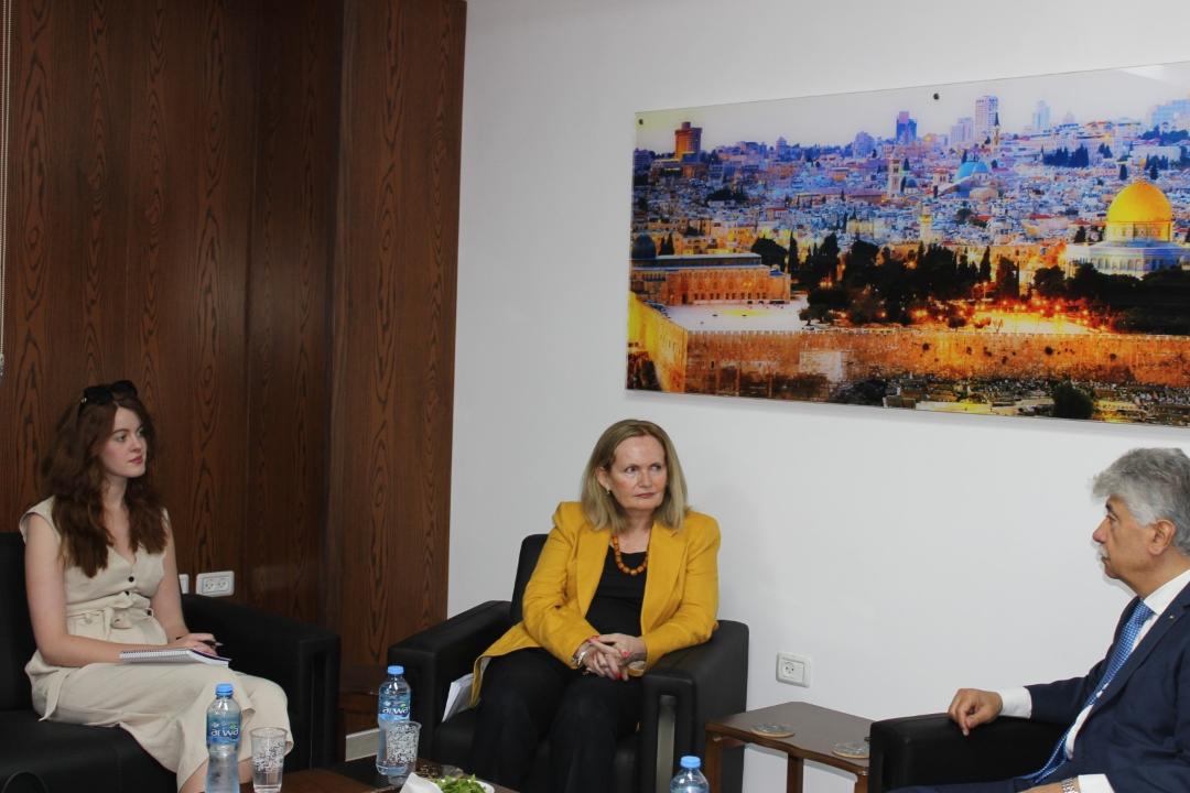 رام الله 26-7-2022 وفا- بحث عضو اللجنة التنفيذية لمنظمة التحرير الفلسطينية، الأمين العام لجبهة النضال الشعبي الفلسطيني، أحمد مجدلاني، اليوم الثلاثاء، بمكتبه في مدينة رام الله، مع القنصل البريطاني العام ديان كورنر، آخر التطورات السياسية في المنطقة.