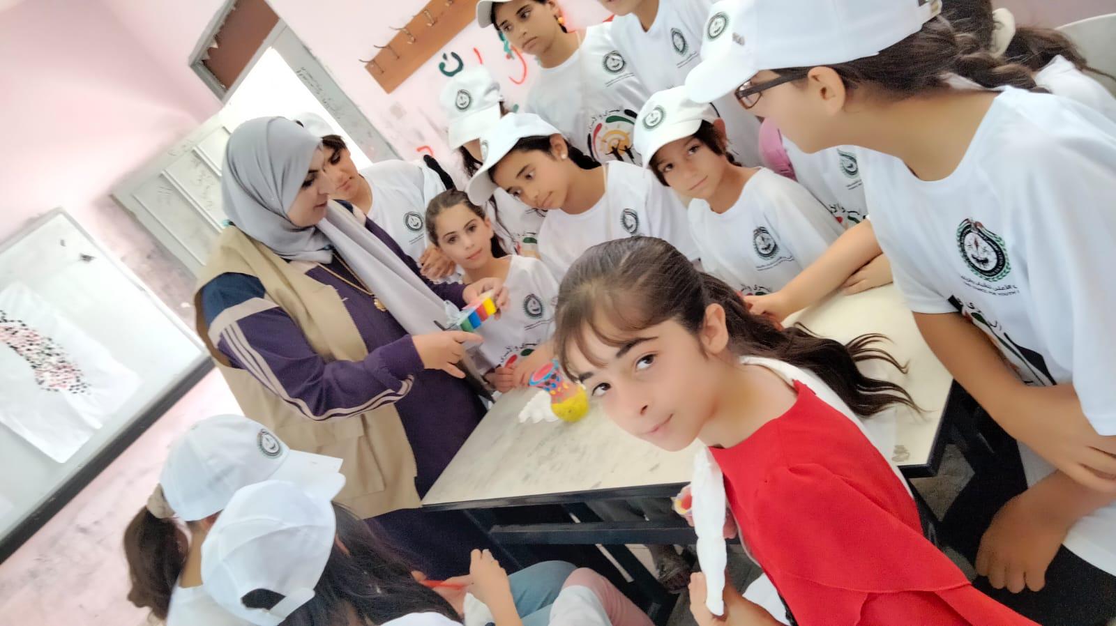 بيت لحم 27-7-2022 وفا- تعكف الأربعينية شيرين زعول، التي تعاني من إعاقة حركية في يدها اليمنى، على تعليم صناعة المشغولات اليدوية للطلائع في المخيم الصيفي "عين الهوية الخامس" في قرية حوسان غرب بيت لحم.