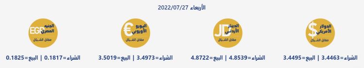 رام الله 27-7-2022 وفا- جاءت أسعار العملات مقابل الشيقل الإسرائيلي، اليوم الأربعاء، حسب سلطة النقد، على النحو التالي: