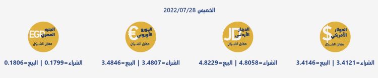 رام الله 28-7-2022 وفا- جاءت أسعار العملات مقابل الشيقل الإسرائيلي، اليوم الخميس، حسب سلطة النقد، على النحو التالي: