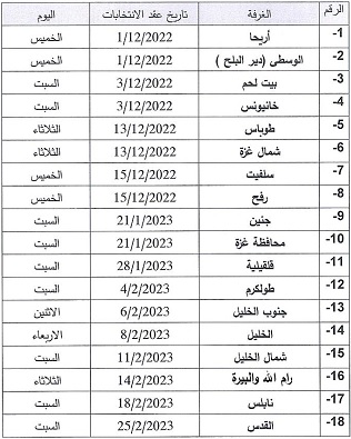 وستبدأ الانتخابات في محافظتي أريحا ودير البلح يوم الخميس الموافق الأول من كانون الأول/ديسمبر، على أن تجري الانتخابات في جميع المحافظات وفق الجدول التالي: