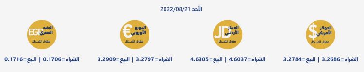 رام الله 21-8-2022 وفا- جاءت أسعار العملات مقابل الشيقل الإسرائيلي، اليوم الأحد، حسب سلطة النقد، على النحو التالي: