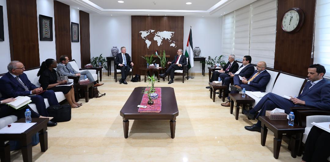 رام الله 23-8-2022 وفا- استقبل رئيس الوزراء محمد اشتية، اليوم الثلاثاء، في مكتبه برام الله، رئيس بعثة صندوق النقد الدولي للضفة الغربية وقطاع غزة ألكسندر تيمان، حيث بحثا تحضيرات اجتماع المانحين (AHLC) المزمع عقده الشهر المقبل في نيويورك.