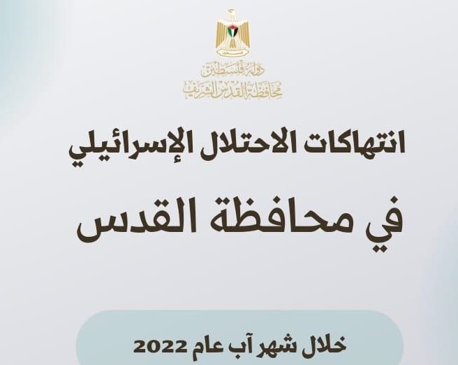 رام الله 1-9-2022 وفا- أصدرت وحدة العلاقات العامة والإعلام في محافظة القدس تقريرها الشهري حول انتهاكات الاحتلال الإسرائيلي في محافظة القدس خلال شهر آب 2022، لخصت فيه مجمل الانتهاكات التي رُصدت خلاله.