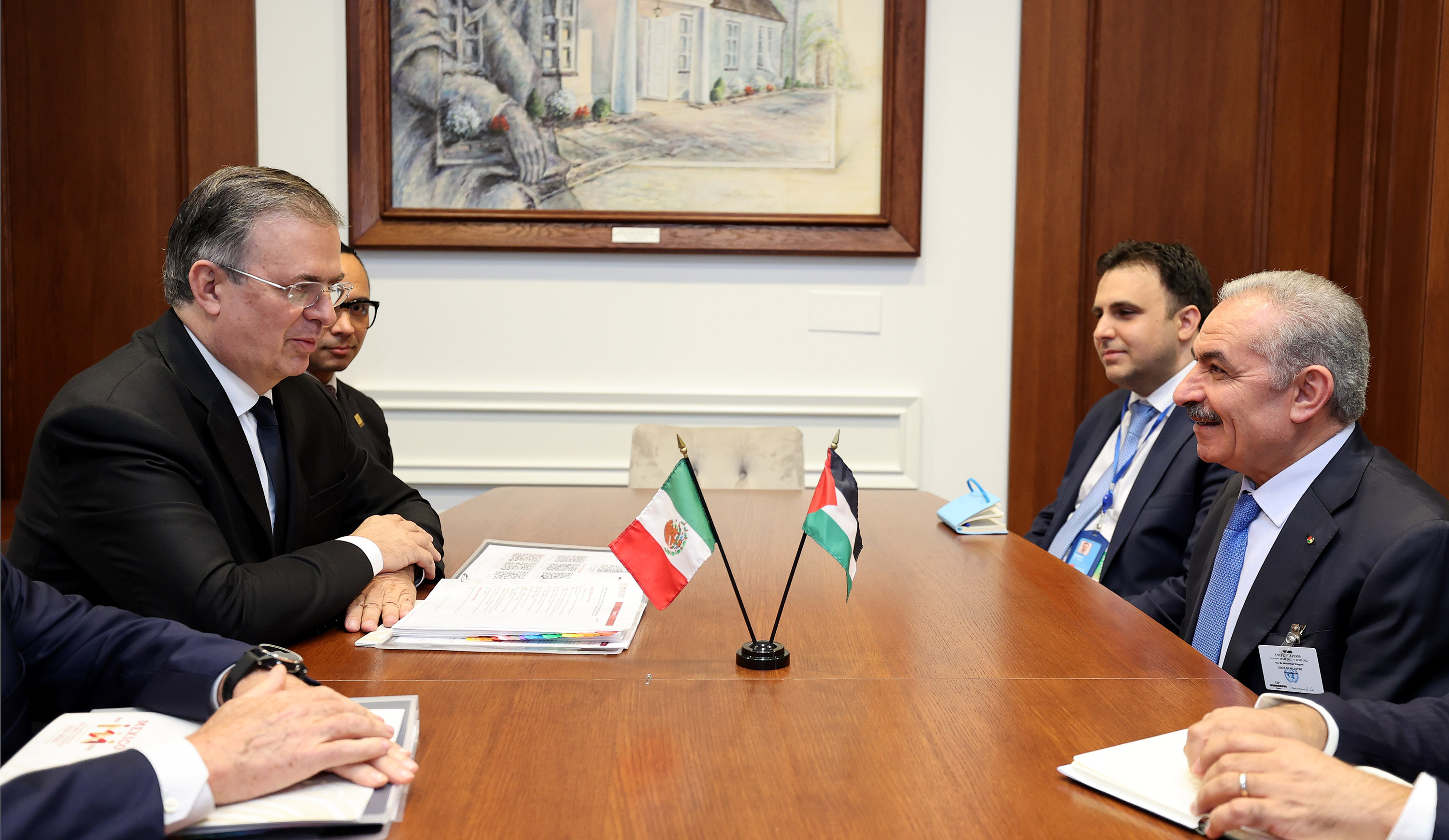 نيويورك 22-9-2022 وفا- بحث رئيس الوزراء محمد اشتية مع وزير الخارجية المكسيكي مارسيلو كازاوبون، ضرورة الاعتراف الدولي بفلسطين من أجل حماية حل الدولتين على أساس الشرعية الدولية، وذلك، اليوم الخميس، في مقر الأمم المتحدة، على هامش اجتماع المانحين "AHLC".