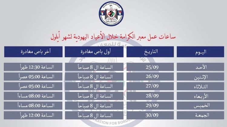 رام الله 22-9-2022 وفا- أعلنت الإدارة العامة للمعابر والحدود، عن ساعات عمل معبر الكرامة خلال الأسبوع المقبل، بسبب الأعياد اليهودية.