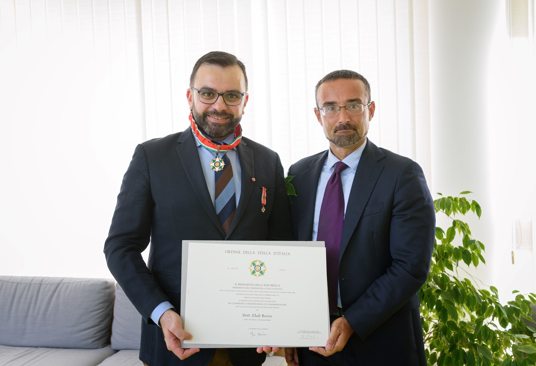 بيت لحم 28-9-2022 وفا- بحضور عدد من الدبلوماسيين الدوليين وممثلي السفارات والقنصليات الدبلوماسية العاملة في فلسطين، ومؤسس ورئيس جامعة دار الكلمة القس متري الراهب ونواب رئيس الجامعة وعمداء الكليات، الى جانب عدد من الشخصيات الاعتبارية الفلسطينية، قلَّد القنصل الإيطالي العام في القدس جوسيببي فيديلي، نيابة عن الرئيس الإيطالي سيرجيو ماتاريلا، الشاعر ووزير الثقافة السابق إيهاب بسيسو، وسام نجمة إيطاليا برتبة فارس.