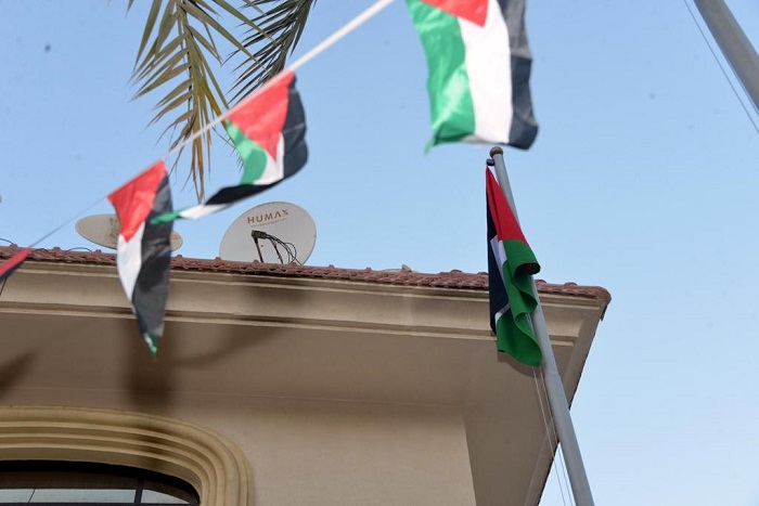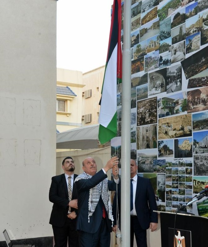 وعلى أنغام النشيد الوطني الفلسطيني، رفع سفير دولة فلسطين لدى مملكة البحرين خالد عارف، علم فلسطين على السارية، في باحة السفارة بالعاصمة البحرينية المنامة.