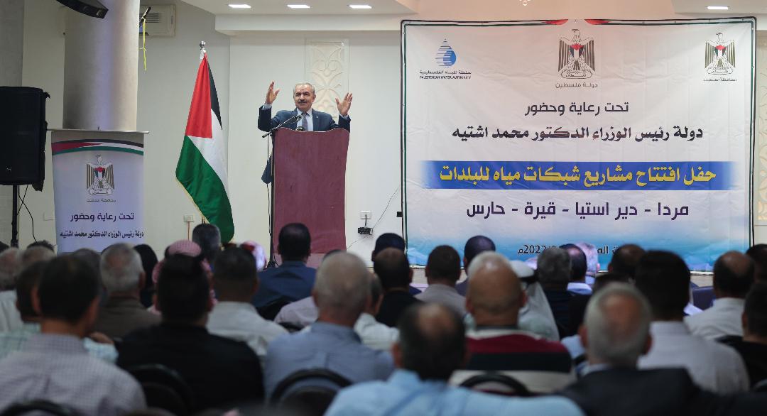 رام الله 3-9-2022 وفا- افتتح رئيس الوزراء محمد اشتية، اليوم السبت، عدة مشاريع شبكات للمياه في بلدات مردا ودير استيا وقيرة وحارس في محافظة سلفيت، بحضور المحافظ عبد الله كميل، ووزير الحكم المحلي مجدي الصالح، ورئيس سلطة المياه مازن غنيم، ورؤساء البلديات والمجالس المحلية، وعدد من الشخصيات الرسمية والاعتبارية وأهالي البلدات.