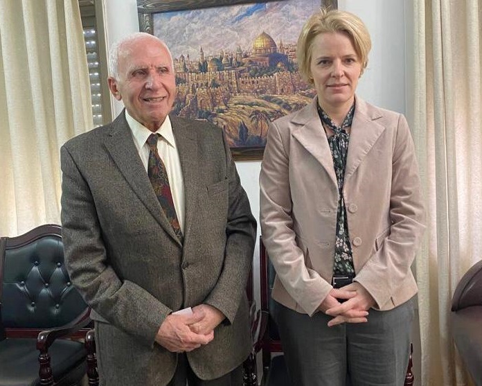 رام الله 10-1-2023 وفا- أطلع عضو اللجنتين التنفيذية لمنظمة التحرير، والمركزية لحركة "فتح"، عزام الأحمد، اليوم الثلاثاء، ممثلة سويسرا لدى دولة فلسطين آن- ليز هينين، على الأوضاع السياسية الفلسطينية، خاصة بعد تشكيل حكومة اليمين المتطرف الإسرائيلية، والإجراءات المتلاحقة التي بدأت تأخذها، واستمرار سياسة العدوان عبر الاقتحامات المتواصلة للمدن والمخيمات والقرى، وأعمال الاستيطان الاستعماري المتواصل في أنحاء الضفة الغربية، واقتحامات المسجد الأقصى المبارك، وسرقة أموال المقاصة.
