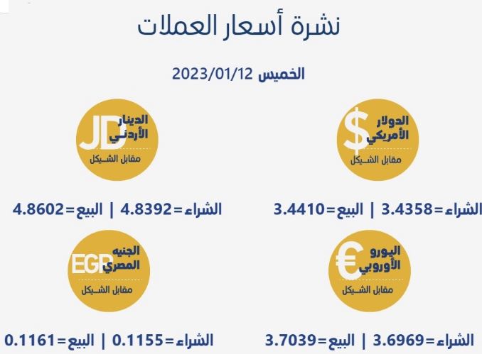 رام الله 12-1-2023 وفا- جاءت أسعار العملات مقابل الشيقل الإسرائيلي، اليوم الخميس، حسب سلطة النقد، على النحو التالي: