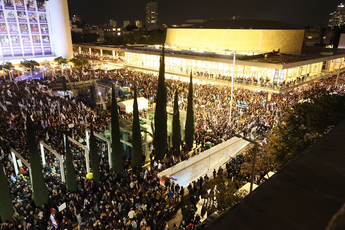 ووفقا لتقديرات الشرطة الإسرائيلية، فإن نحو 80 ألف متظاهر وصلوا إلى ساحة "هابيما" في تل أبيب حيث المظاهرة المركزية احتجاجا على حكومة نتنياهو وخطة وزير القضاء الإسرائيلي ياريف ليفين.