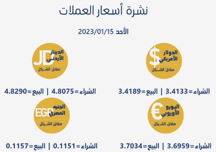 رام الله 15-1-2023 وفا- جاءت أسعار العملات مقابل الشيقل الإسرائيلي، اليوم الأحد، حسب سلطة النقد، على النحو التالي: