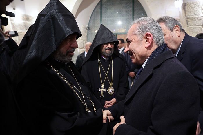 وهنأ اشتية باسم سيادة الرئيس محمود عباس ومجلس الوزراء أبناء شعبنا من الأرمن بمناسبة حلول عيد الميلاد المجيد، قائلا: "نحتفل تحت سقف واحد في بيت لحم مهد السيد المسيح، توأم القدس معراج سيدنا محمد عليه الصلاة والسلام".