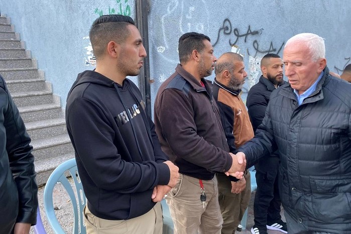 جنين 20-1-2023 وفا- قدم عضو اللجنتين التنفيذية لمنظمة التحرير، والمركزية لحركة "فتح" عزام الأحمد، مساء اليوم الجمعة، واجب العزاء يالشهيدين أدهم محمد باسم جبارين، والمدرس الشهيد جواد فريد بواقنة في مقر نادي مخيم جنين، اللذان استشهدا برصاص الاحتلال فجر أمس الخميس.