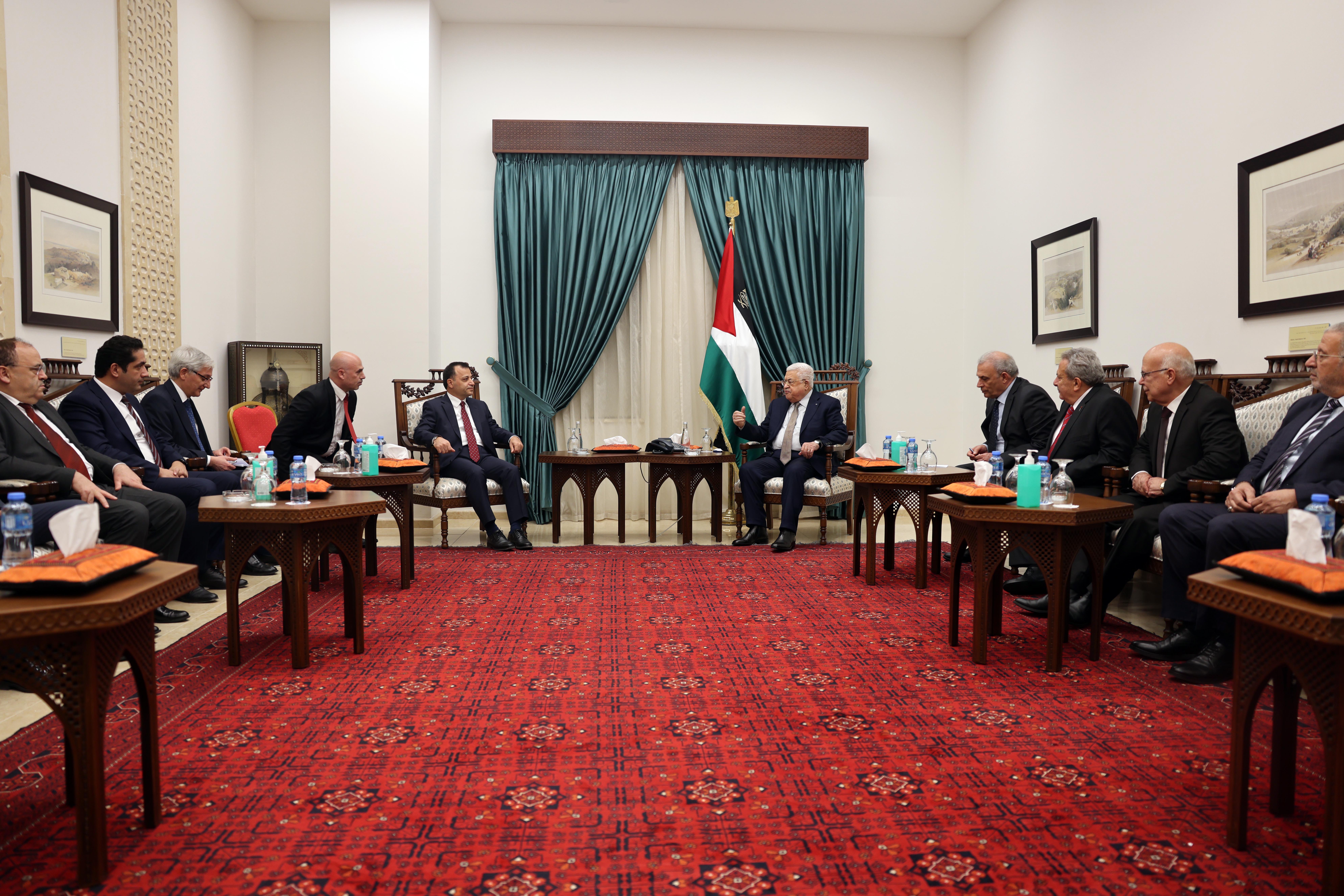 رام الله 20-1-2023 وفا- استقبل رئيس دولة فلسطين محمود عباس، اليوم الجمعة، في مقر الرئاسة بمدينة رام الله، رئيس وأعضاء المحكمة الدستورية التركية، بحضور القنصل العام التركي في القدس.
