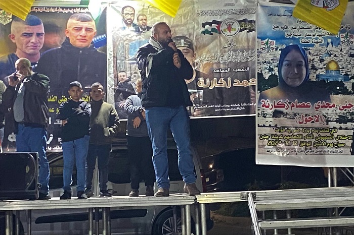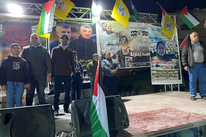 جنين 20-1-2023 وفا- نظمت حركة التحرير الوطني الفلسطيني "فتح" في جنين، مساء اليوم الجمعة، مهرجانا تأبينيا للشهداء: عطا الشلبي زكارنة من بلدة قباطية، طارق الدمج من مخيم جنين، الطفلة جنى زكارنة، صدقي صديق زكارنة من مدينة جنين، الذين ارتقوا برصاص قوات الاحتلال الإسرائيلي مؤخرا.