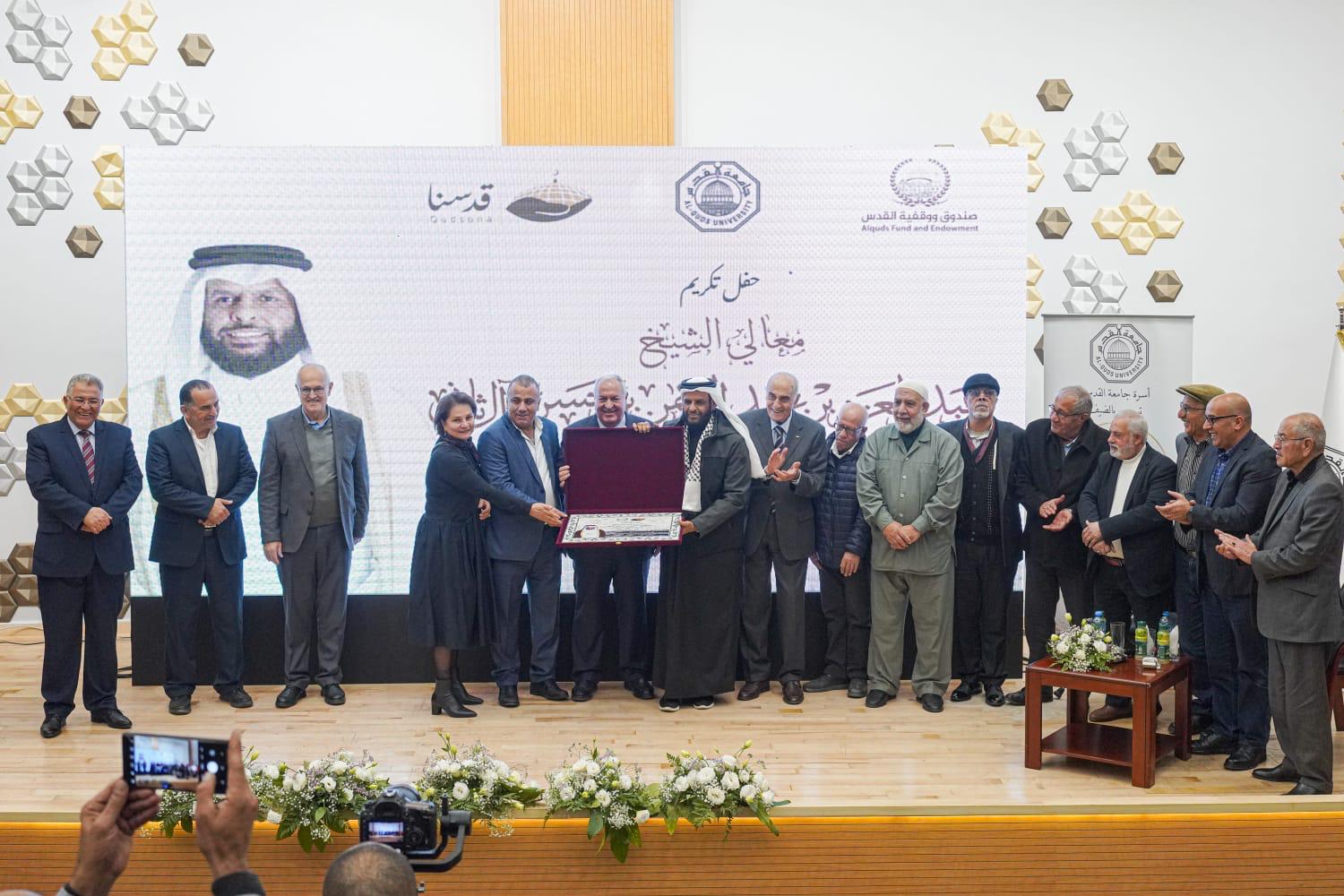 جاء ذلك على هامش تكريم رئيس مجلس أمناء مؤسسة "قدسنا الوقفية" الشيخ عبد العزيز بن عبد الرحمن آل ثاني، بمشاركة رئيس مجلس إدارة صندوق ووقفية القدس منيب المصري، ورئيس جامعة القدس، أمين سر صندوق ووقفية القدس عماد أبو كشك، بحضور حشد من الشخصيات الفلسطينية والفعاليات المقدسية.