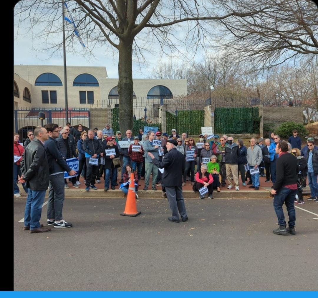 واشنطن 3-1-2023 وفا- شارك العشرات من أنصار الحق الفلسطيني في الولايات المتحدة الأميركية في تظاهرة نظمت، اليوم الثلاثاء، أمام السفارة الإسرائيلية في واشنطن، احتجاجا على الحكومة الإسرائيلية اليمينية المتطرفة بقيادة نتنياهو.