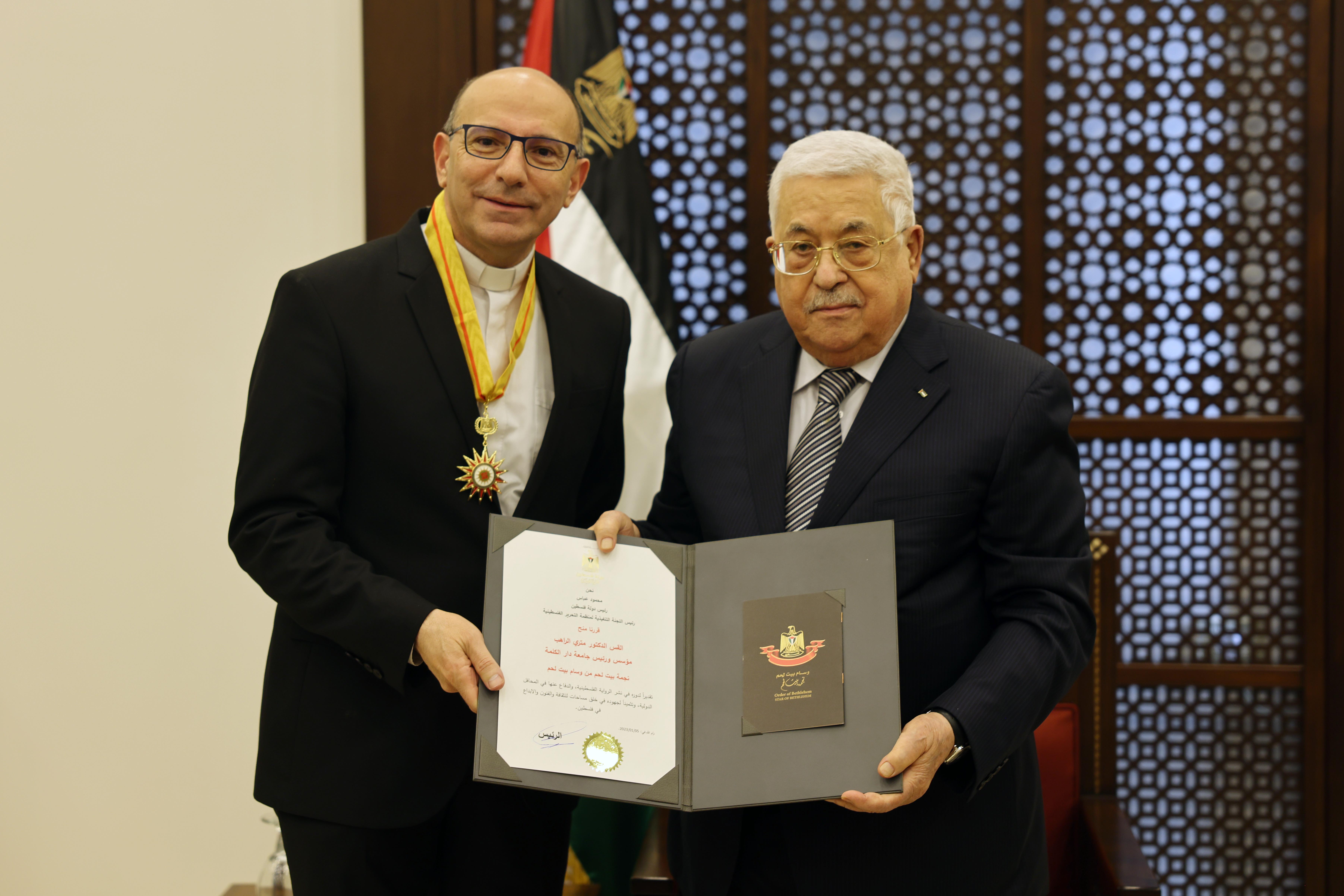 بيت لحم 6-1-2023 وفا- منح رئيس دولة فلسطين محمود عباس، اليوم الجمعة، مؤسس ورئيس جامعة دار الكلمة، القس الدكتور متري الراهب نجمة بيت لحم من وسام بيت لحم.