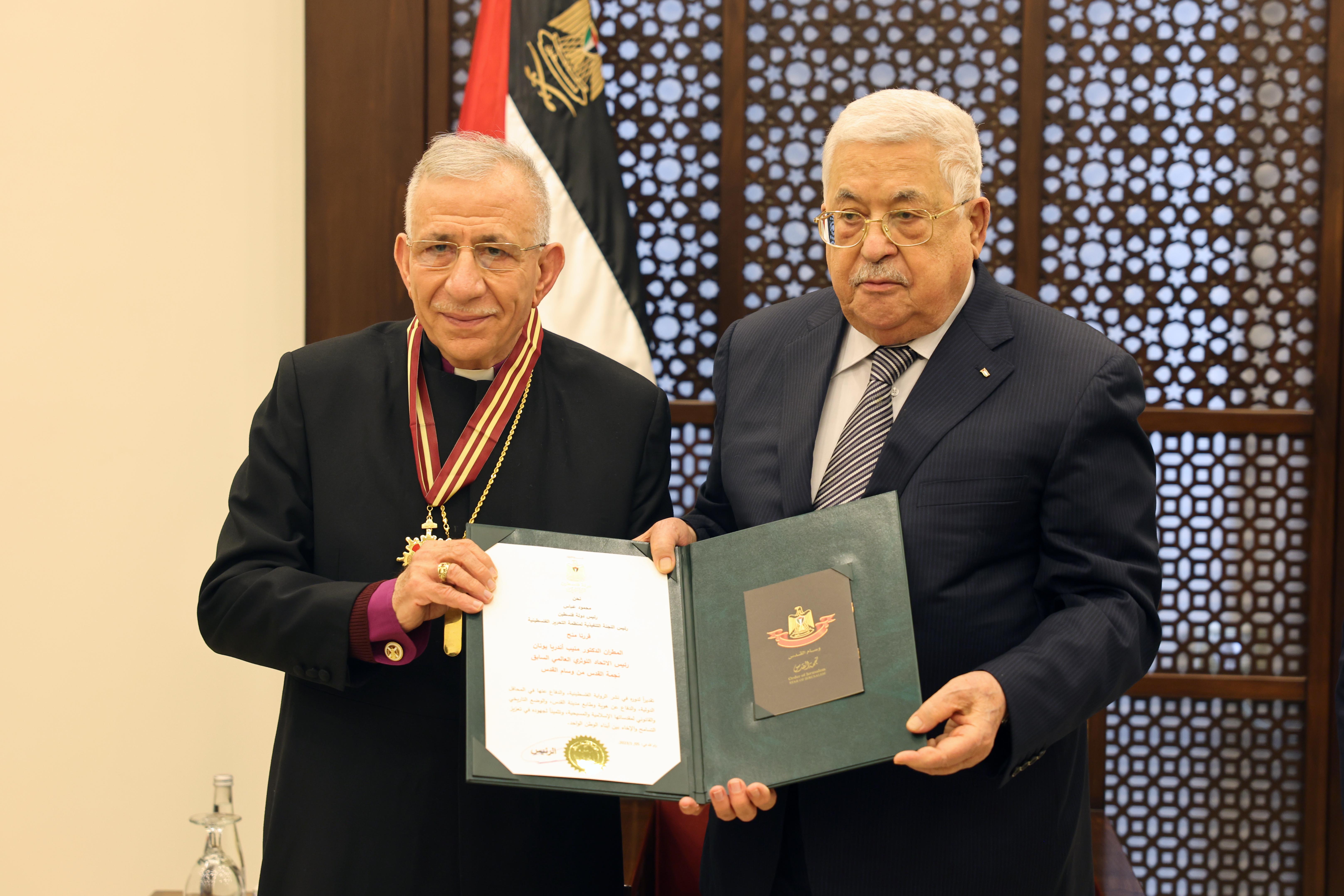 بيت لحم 6-1-2023 وفا- منح رئيس دولة فلسطين محمود عباس، اليوم الجمعة، رئيس الاتحاد اللوثري العالمي السابق المطران الدكتور منيب أندريا يونان، نجمة القدس من وسام القدس.