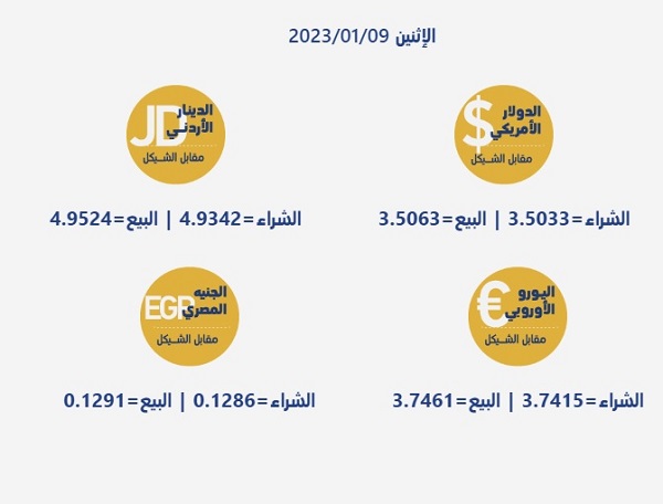 رام الله 9-1-2023 وفا- جاءت أسعار العملات مقابل الشيقل الإسرائيلي، اليوم الاثنين، حسب سلطة النقد، على النحو التالي: