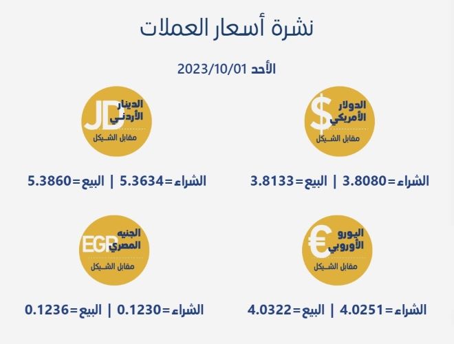 رام الله 1-10-2023 وفا- جاءت أسعار العملات مقابل الشيقل الإسرائيلي، اليوم الأحد، حسب سلطة النقد، على النحو التالي:
