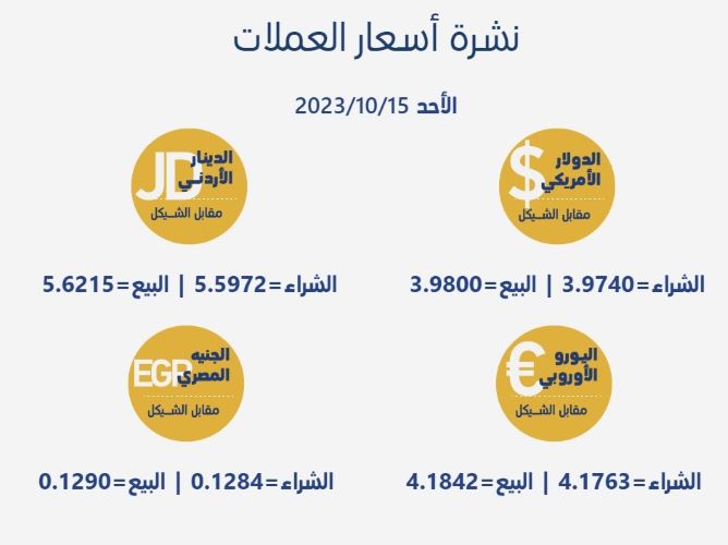 رام الله 15-10-2023 وفا- جاءت أسعار العملات مقابل الشيقل الإسرائيلي، اليوم الأحد، حسب سلطة النقد، على النحو التالي: