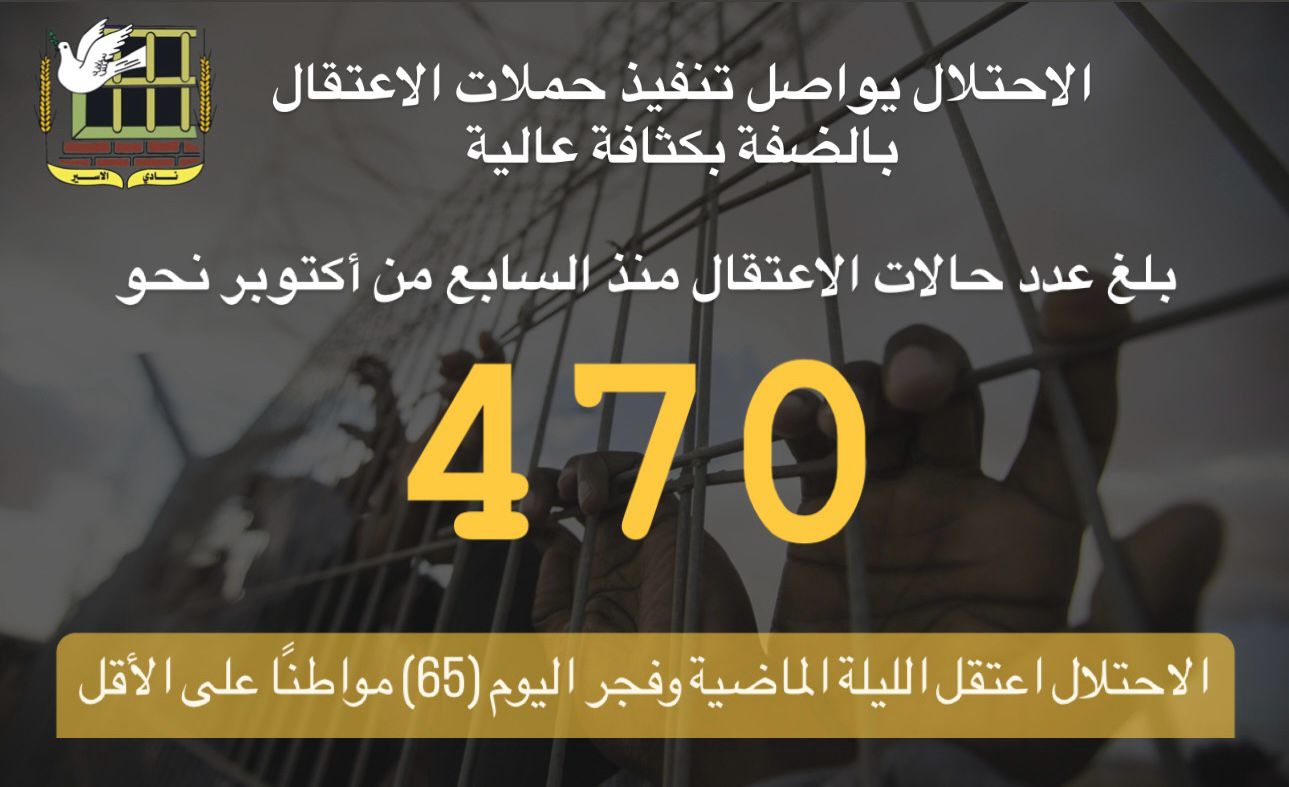 وأوضح النادي في بيان صدر عنه، اليوم الأحد، بأن عدد حالات الاعتقال منذ بدء عدوان الاحتلال الإسرائيلي الشامل على شعبنا في السابع من تشرين الأول/ أكتوبر الجاري، بلغ نحو 470 حالة اعتقال من الضفة الغربية، شملت كافة الفئات، إلى جانب المعتقلين من العمال داخل أراضي الـ48، وغزة التي لم يعرف أعدادهم بشكل دقيق حتّى اليوم.
