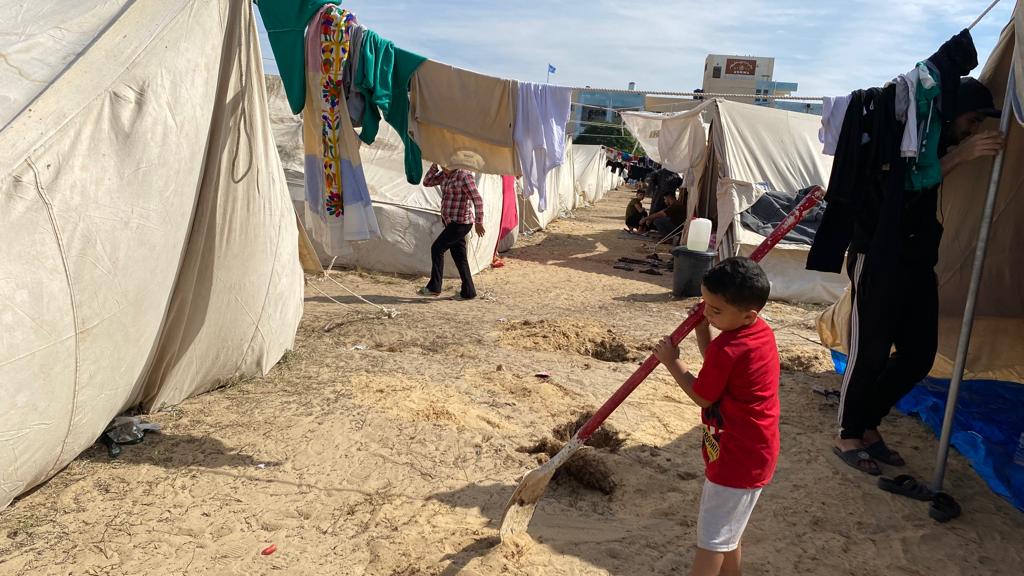 أطفال يستلقون في الخيام وآخرون يحملون قنينات فارغة بحثا عن تعبئتها بمياه تصلح للشرب أو لصناعة الحليب. طفل جلس يتقيأ بجانب عامود كهرباء وأخرى تسأل الصحفيين عن موعد انتهاء الحرب.